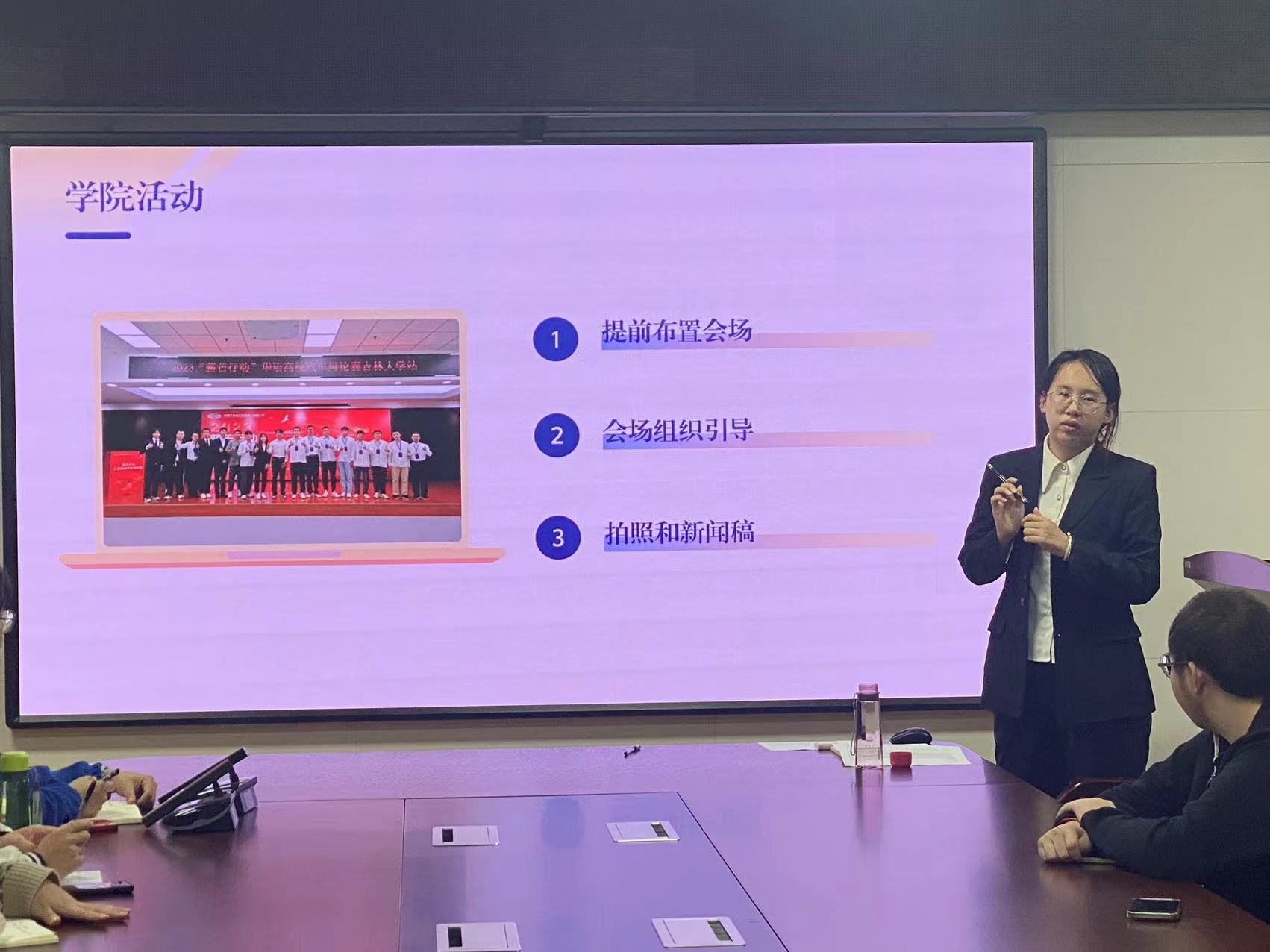 会议由尹万桀主持,并介绍岗位的工作职能,由齐芮介绍工作内容,并对相关工作要求进行强调。培训工作内容主要包括:协助老师统筹和主持各项员工活动、日常稿件撰写的格式和内容、新闻推送配图的拍摄要点等。
