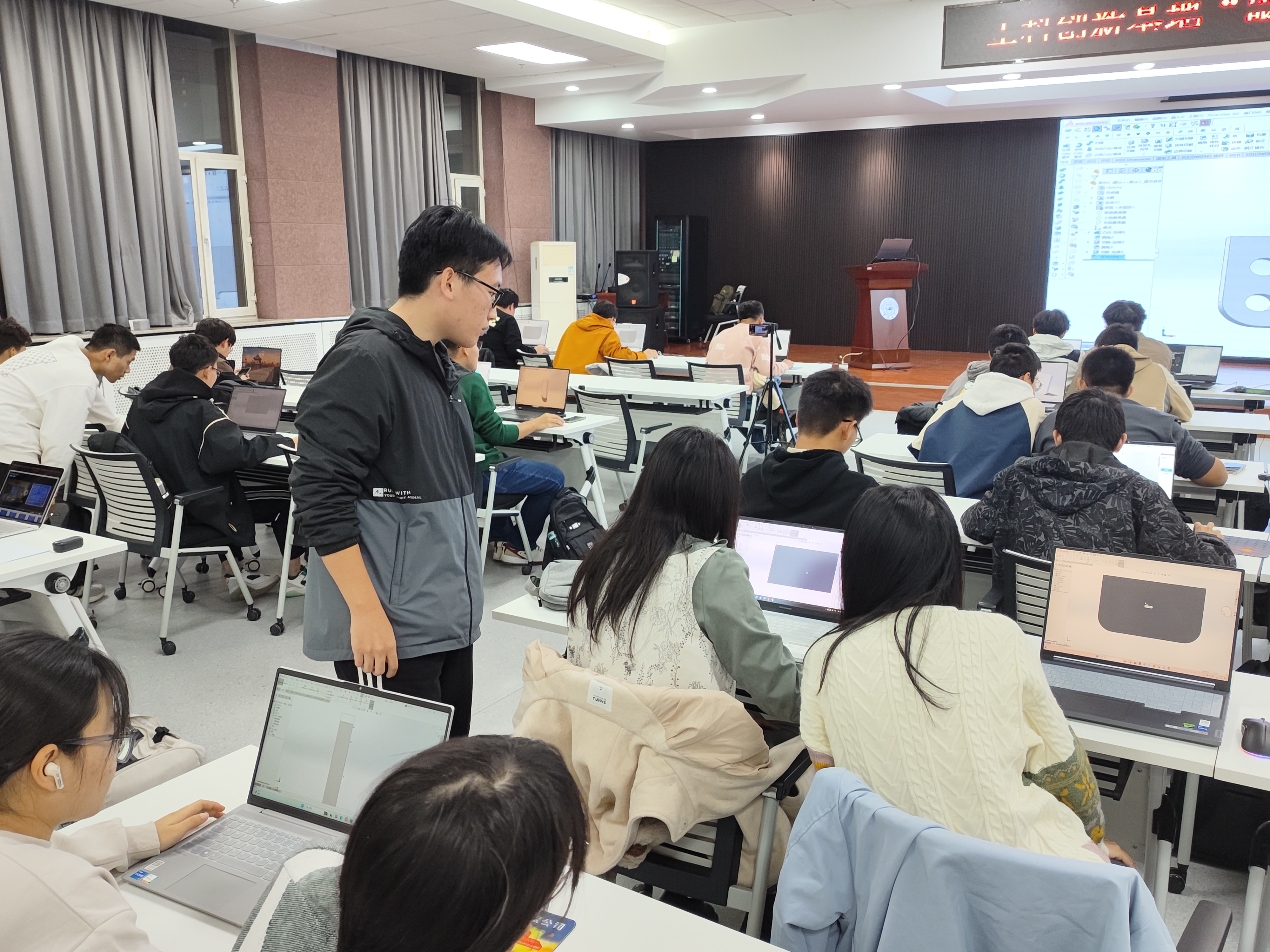在培训的过程中,辛崇毅同学及其他工科创新基地成员积极的到同学中进行详细指导并解决问题,帮助大家深入理解、运用Solidworks的各项功能。