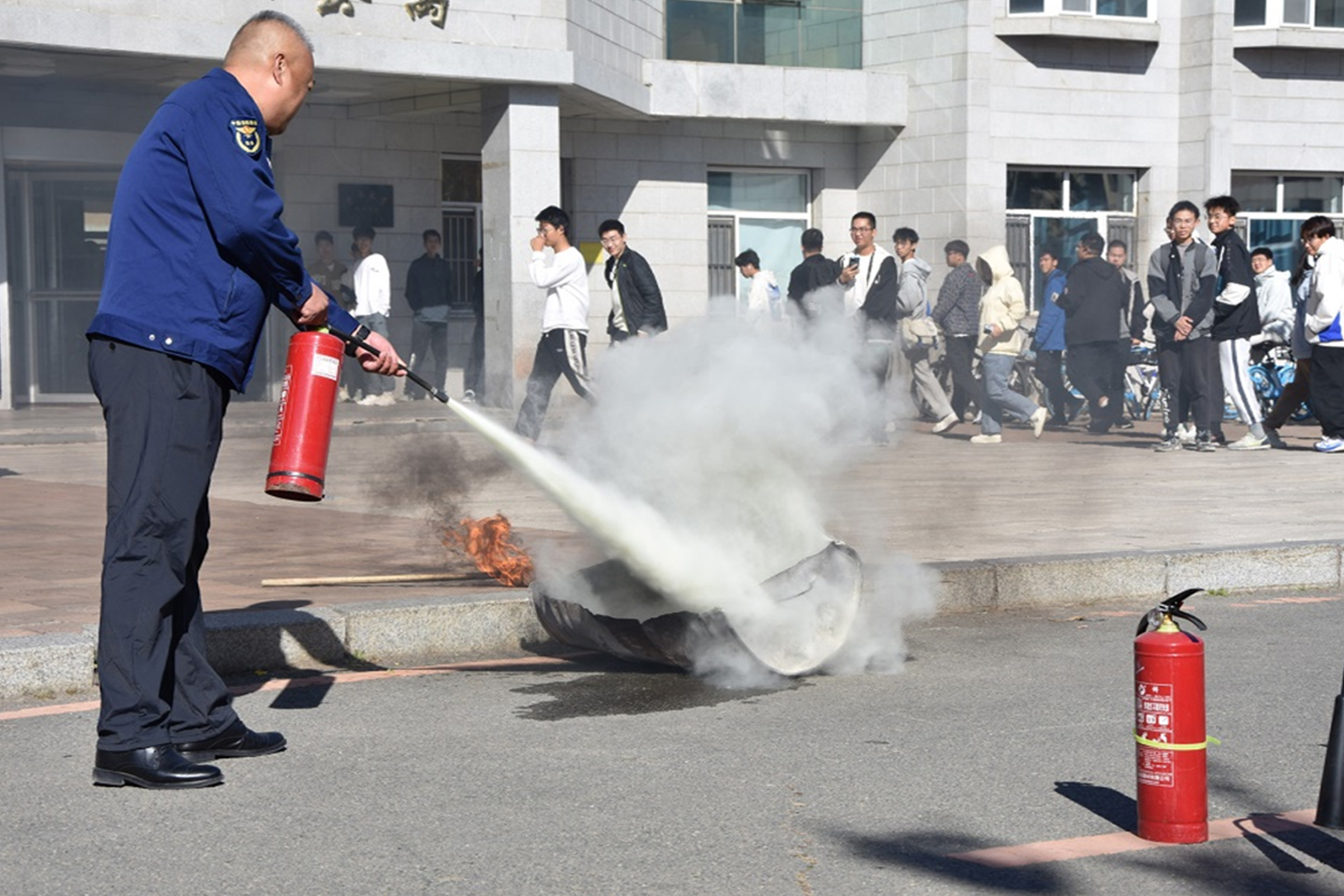 疏散演练结束后,员工立即进入灭火演练现场。工作人员详细地向员工讲解各类灭火器及使用方法,使员工了解不同类型火灾的特点和应对策略。随后,保卫部门模拟在火灾现场的实际操作并指导师生亲自实践灭火演练。