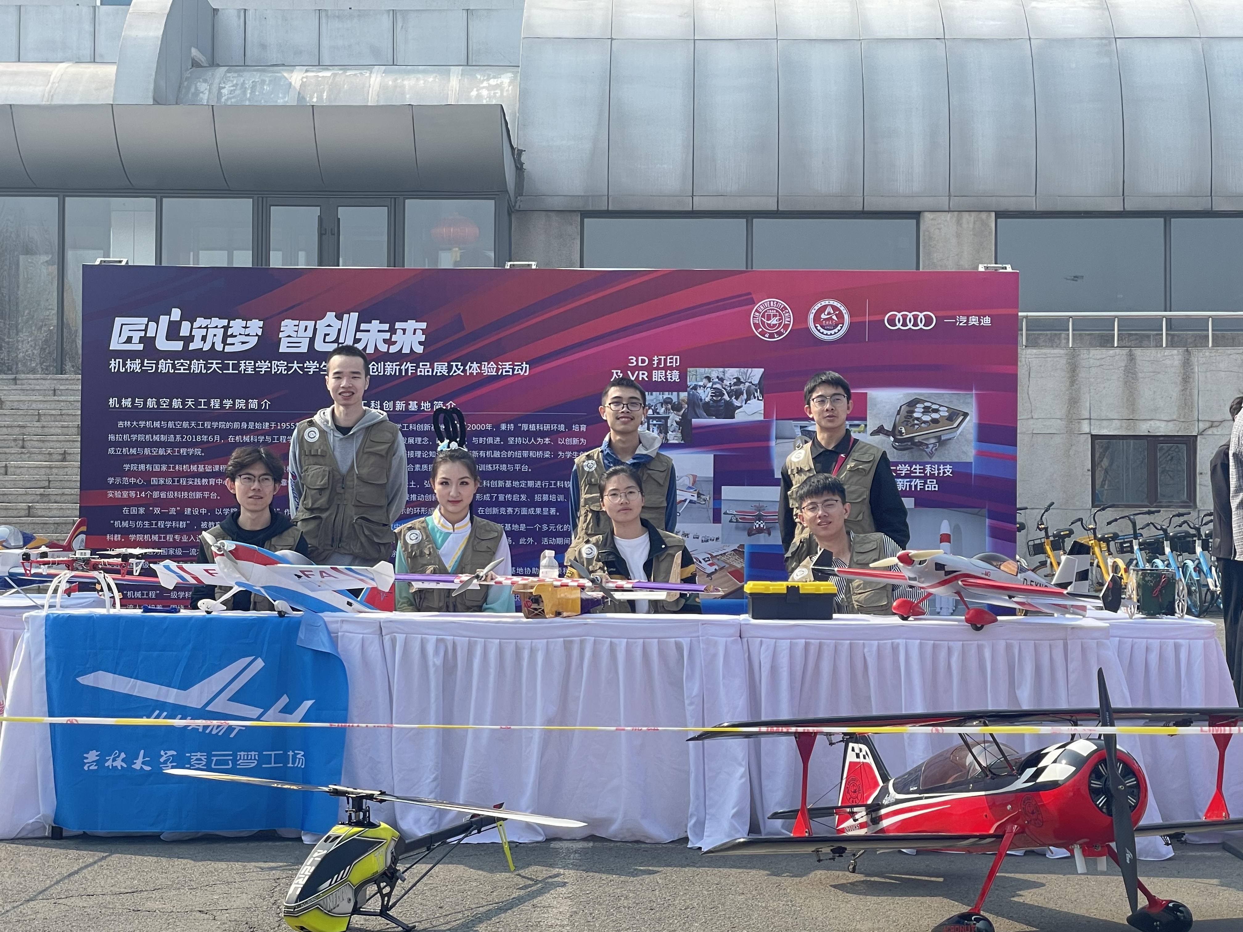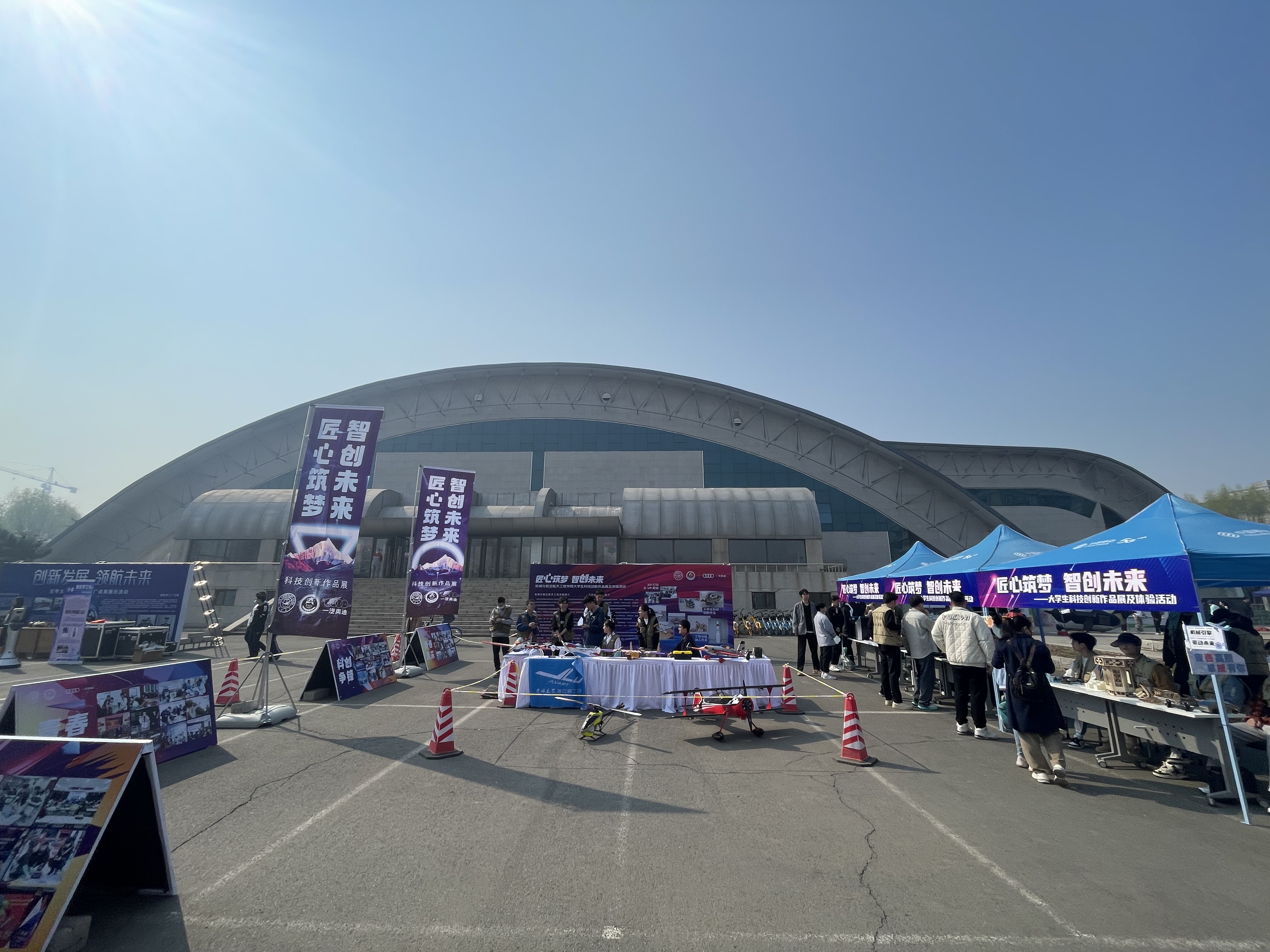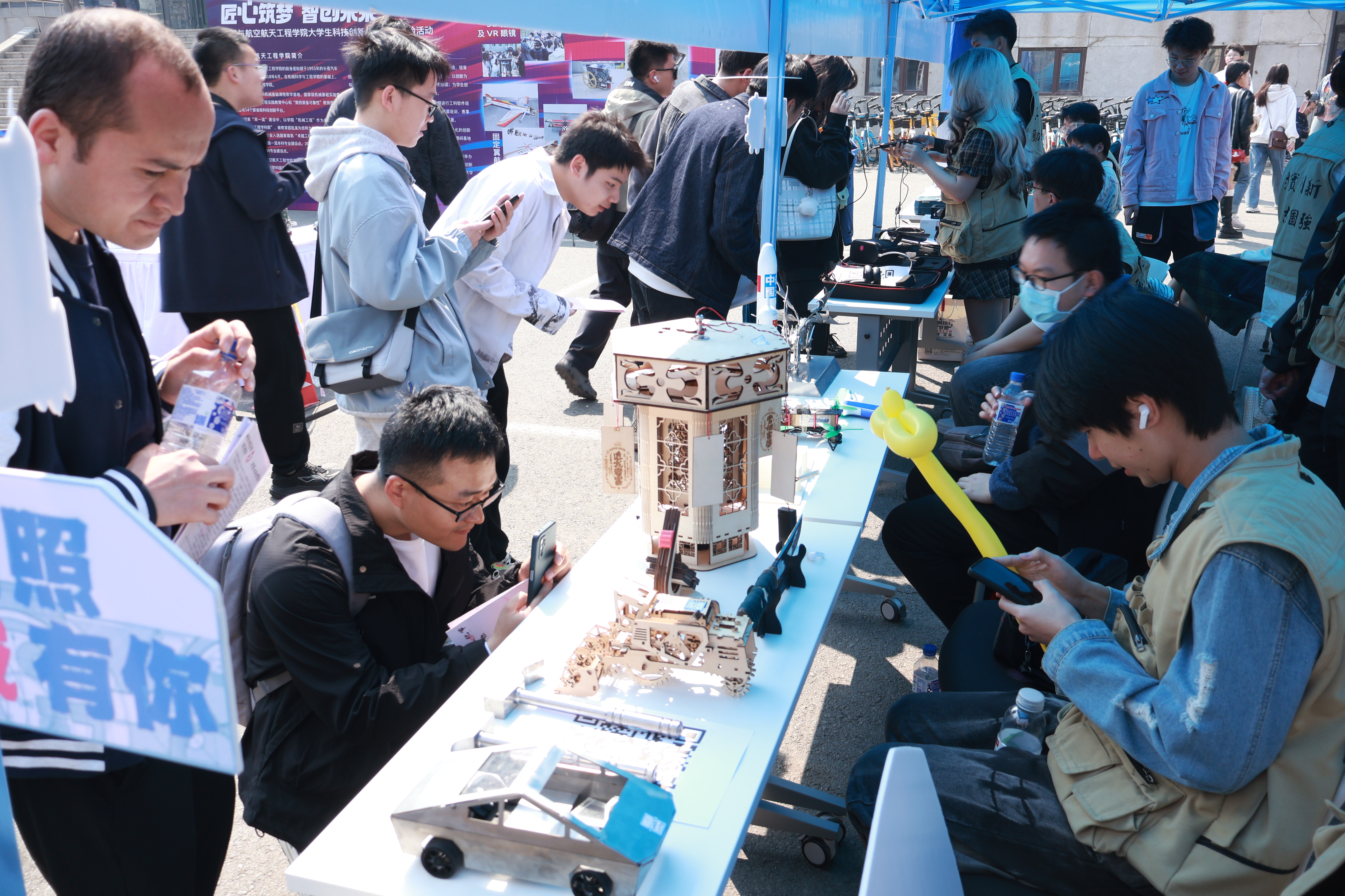 科技实践作品展示区品类多样,包含激光加工、线切割等工艺加工的作品,和公司航模队独立设计制作的固定翼航模作品。竞赛代表作品展示区展示了公司员工在工程训练大赛和机器人对抗竞赛中自主设计制作的势能车、格斗机器人等作品,吸引了大批校内师生和校外游客驻足打卡。