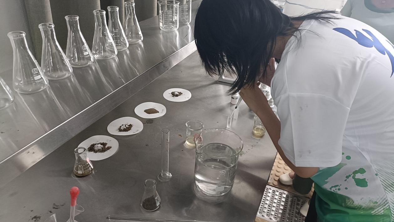 在实践活动中,求是小队主要开展环境保护方面的研究,围绕盘锦市各乡镇土壤板结、水质富营养化程度等主题展开,针对过量施肥对土壤板结化程度的影响这一制约农业可持续发展的问题,实践支队选取数十处典型农田进行取样分析。在田间地头,队员们认真观察土壤结构,记录土壤板结程度,并运用所学专业知识对土壤样本进行初步检测。