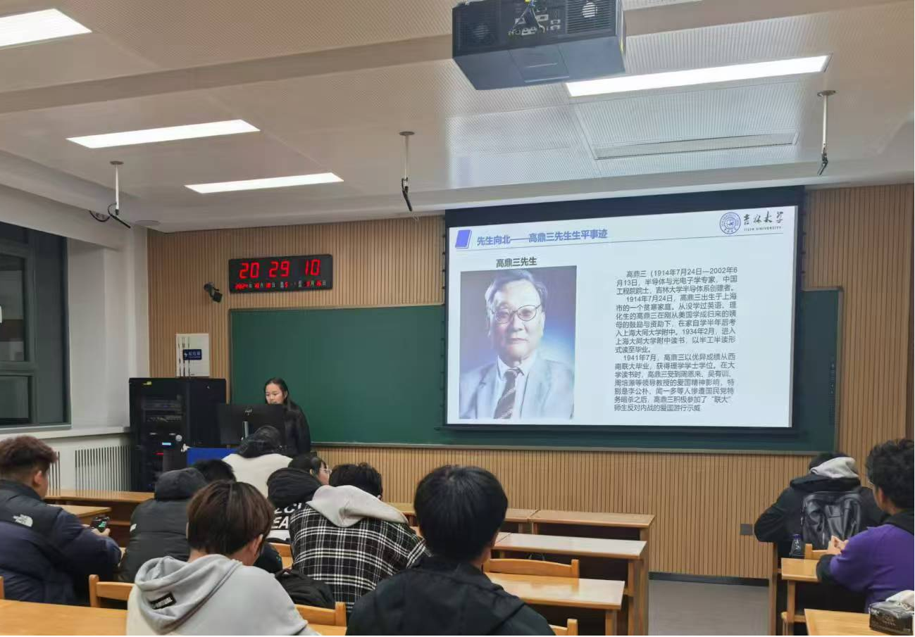 142401班本科生吉语晗介绍了高鼎三先生的卓越贡献与崇高精神,从《宜兴日报》对高鼎三先生的高度评价中汲取灵感,为在场的每一位同学勾勒出了一位爱国科学家的光辉形象。《宜兴日报》曾这样评价高鼎三先生:“高鼎三为中国的半导体事业、科教事业作出了不可磨灭的贡献。在他生命的最后时光里,他想到的仍是国富民强,科技进步。爱国,是他一生的精神信念,他的身上始终闪耀着如此纯粹的精神之光。”