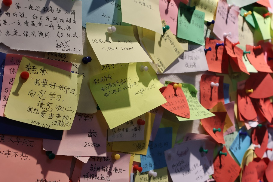 活动伊始,全体同学在地质宫五楼集合,怀着崇敬的心情面向黄大年老师的纪念铜像,向黄大年老师鞠躬,表达同学们的怀念之情,随后由员工代表向黄大年老师献鲜花,花束上系着卡片,上面写上了同学们想对黄大年老师说的话,寄托着同学们对黄大年老师的无限敬仰和深切缅怀。
