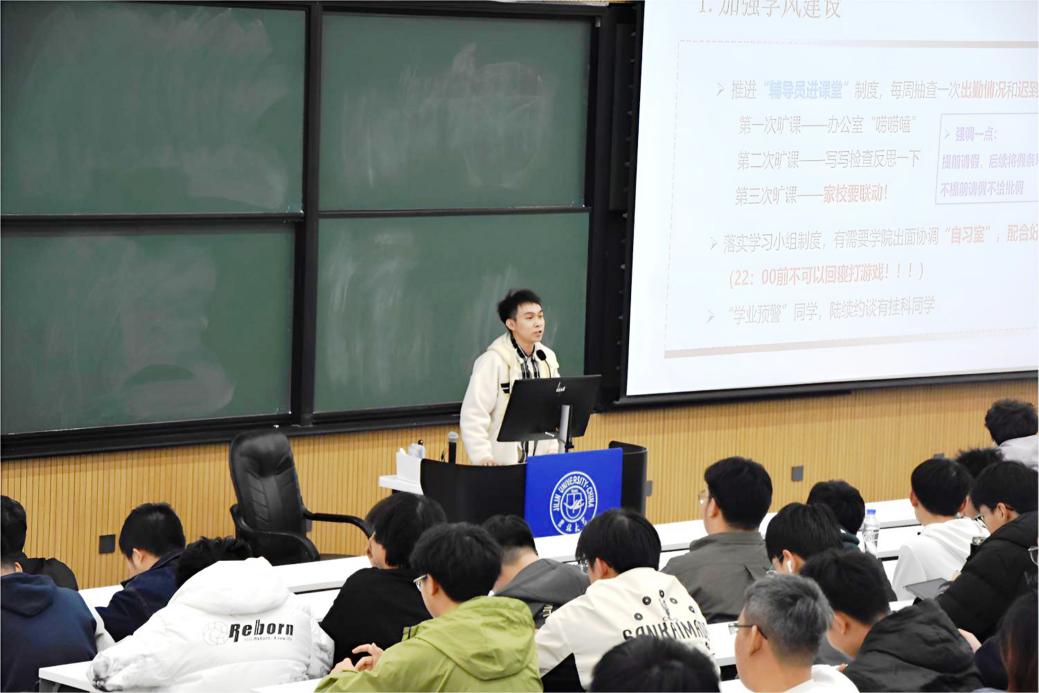 接着,由范宝元老师召开年级大会。首先,范老师要求全体员工应加强学风建设,推进“辅导员进课堂”制度,完善学习小组建设,加强对同学们自习的管理。其次,大会强调应加强寝室管理,做到无违章电器和加强卫生清扫,提高寝室检查频率。同时,范宝元老师高度关注同学们的生活状态,鼓励同学们与他人积极沟通。随后,范老师对同学们假期安全与防骗防诈等方面进行了温馨的提醒。最后,范老师向同学们展示了部分有关古天乐代言太阳集团学士学位授予的相关细则,叮嘱同学们认真学习,不要违反校纪。