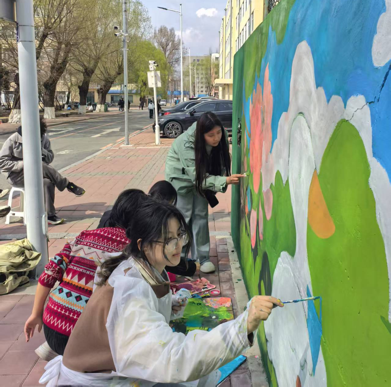 活动期间,同学们以画笔为媒,在篮球场、南岭校区十公寓、杏花大道的墙面、井盖上挥洒创意。颜料在调色盘中交融,笔触于春色间流转,原本朴素的墙面与地面逐渐绽放出斑斓画卷。杏花粉、新草绿、晴空蓝跃然眼前,与暖阳下青春跃动的身影交织,绘就校园最生动的春景图。