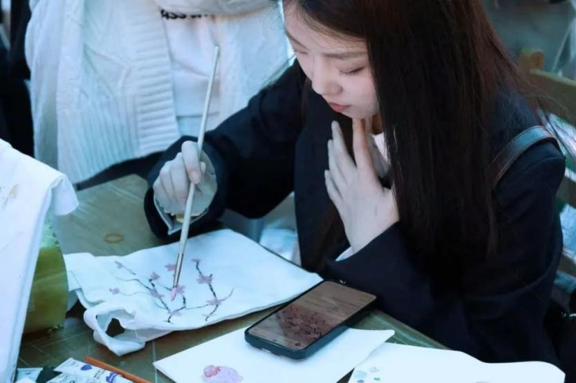 在植物标本拓印活动中,大家拾起一片绿叶,捡起一朵落花,随着"笃笃"轻响,花瓣的轮廓在渐次浮现——杏蕊的纤柔、叶脉的蜿蜒、枝干的虬劲,春意的盎然皆显影如画。原本只可意会不可言传的绝美春景也在这一刻具象化,生命的活力,盎然的生机也在这一刹获得永存,伴留在我们身边。