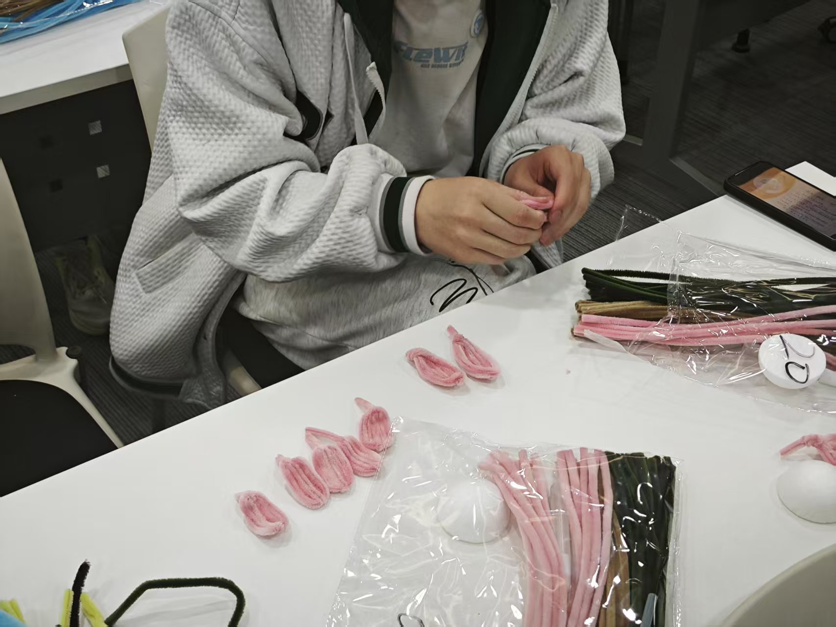 活动包括“手工扭花制作”与“水拓丝巾”两个特色活动。在手工扭花制作活动中,同学们手握扭扭棒,巧思妙想,通过弯折、扭转等手法,将这一柔软材料幻化成一束束精美的康乃馨、玫瑰等立体花束,每一朵花都饱含着对母亲的感激与敬爱。