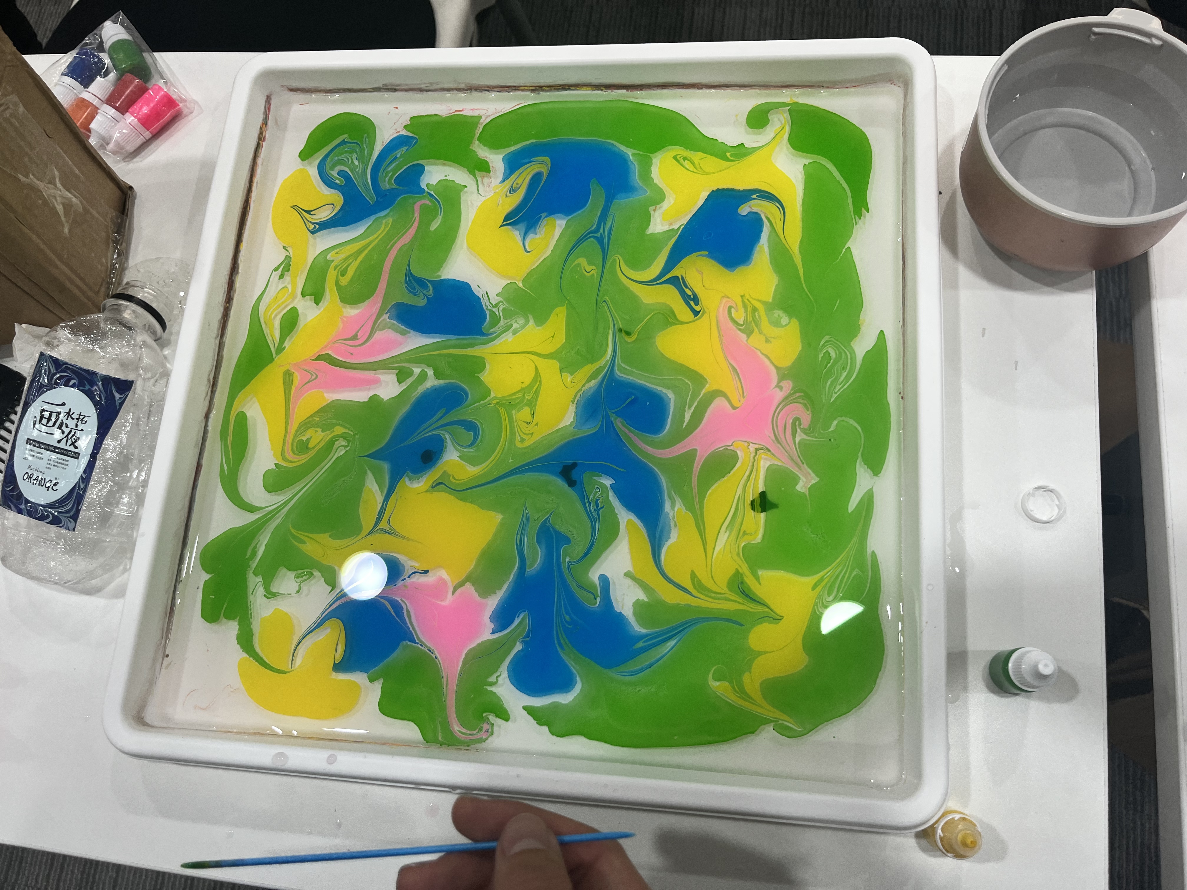 水拓丝巾活动中,同学们挥毫泼墨,让各色颜料于水面交融、扩散、绽放,形成独特的图案,随后将其拓印在丝巾之上。一条条丝巾在同学们的巧手下变得独一无二,它们宛如情感的载体,满载着同学们对母亲深切的情谊与诚挚祝福,成为了一份份饱含心意的节日礼物。
