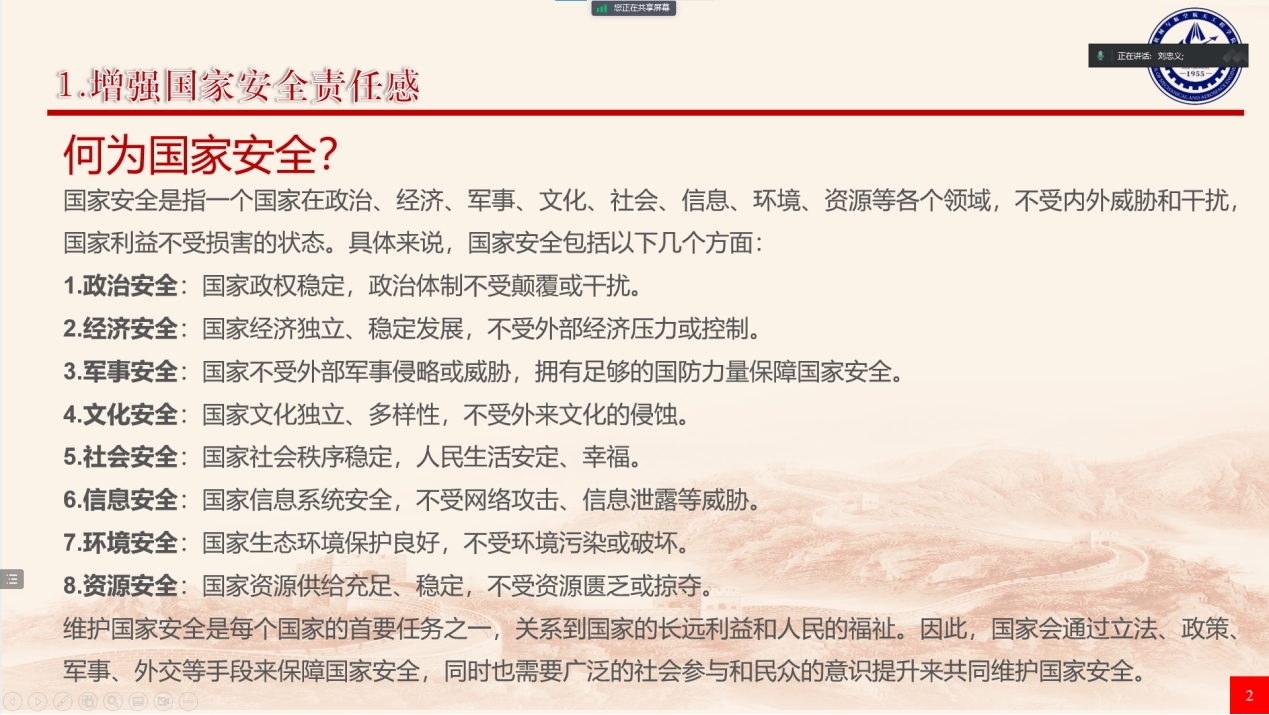 为进一步增强研究生党员的国家安全意识和责任感,提升防范风险的能力,5月19日下午,公司线上开展研究生党员国家安全教育活动。2022级硕士研究生第二党支部书记刘忠义主持。