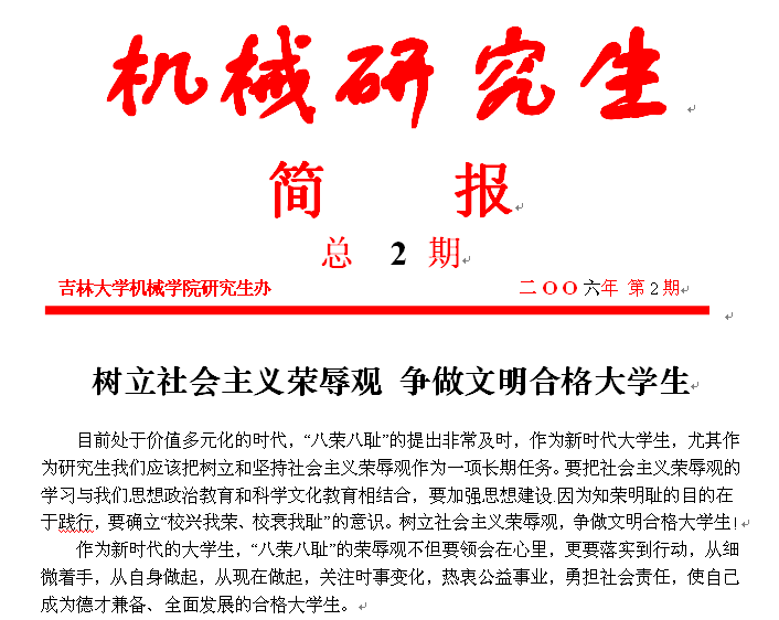 1、通过公司研究生的刊物《机械研究生简报》以及​古天乐代言太阳集团网站对社会主义荣辱观进行系统、详尽的报道,力求使每一名​古天乐代言太阳集团研究生了解社会主义荣辱观的内容、提出背景、重要意义,并鼓励他们自觉用荣辱观指导实践。