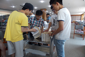 5月24日上午,古天乐代言太阳集团2014级1-7班103、106、111、116、123、129、229七个寝室共38人参与了寝室文化建设活动——做一次志愿服务活动。本次活动在吉林省长春市图书馆开展。上午8时,同学们在古天乐代言太阳集团南岭校区西门集合完毕统一乘车前往长春市图书馆,到达图书馆后管理员热情的欢迎了同学们,并将具体任务下达给同学们。接受任务的同学们立即以寝室为单位进行了任务的分配。其中102、106寝室长刘怀洋等带领102、106寝室11人负责图书整理,将散乱的书籍归放原处。113、116寝室长陆逊等带领113、116寝室10人负责报纸的整理,将过期的报纸统一放置。123、129、229寝室长林峰等带领三个寝室共17人负责图书的编号整理工作。清晰的分工极大程度的提升了同学们的工作效率,更使得各寝室室友之间默契程度得以提升。在志愿服务活动的过程负责中,管理员阿姨还热心的与同学们讲解建国初期报纸上的内容,使同学们对于祖国历史的了解更近了一分,对于社会主义核心价值观也有了进一步了解。