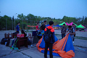 凌晨3点,员工干部们在南岭校区集结,迎着清晨的第一缕阳光开始了他们的工作。他们把帐篷、垫子、桌椅、食物和水整装上车,向着前卫南区进发。一路上大家欢声笑语,学长向学弟学妹们讲述上一年的这个时候发生的故事,回答他们各种脑洞大开的问题。新生对运动会这种大型活动总是有一种天生的好奇心和强烈的参与感。当他们到达目的地,天已经大亮。趁着温度不高,员工干部们抓紧时间在指定地点按部就班、有条不紊地搭起帐篷,一点一点地完成了大本营的布置工作。等工作全部完成,其他部门的同学,以及运动员们也陆续抵达。年轻的员工干部和运动员们也已经完全准备好,准备好展示他们青春的运动活力、饱满的比赛热情以及年轻的无限力量。