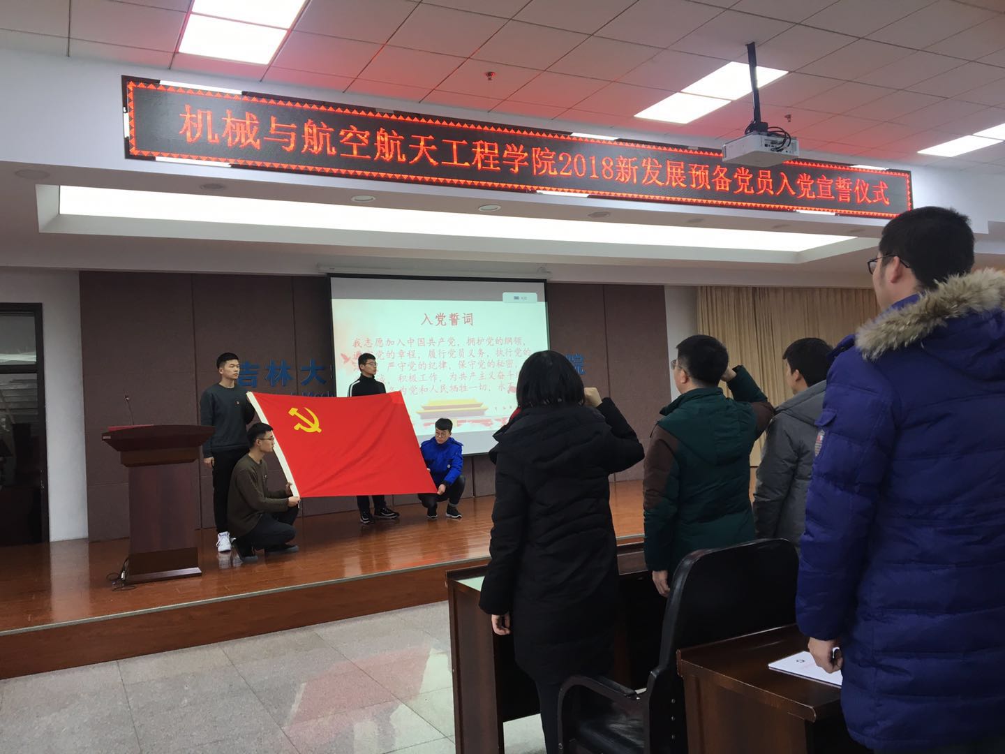 为加强党员党性教育,弘扬全心全意为人民服务的宗旨,2018年12月14日,机械与航空航天工程公司党委隆重举行2018年新发展党员入党宣誓暨老党员重温入党誓词仪式,公司党委书记程钺同志、党委副书记王柏同志、党委办公室主任、研究生秘书、本科辅导员,以及新发展的59名党员、党员代表、积极分子代表参加了本次活动。仪式由党委副书记王柏同志主持。