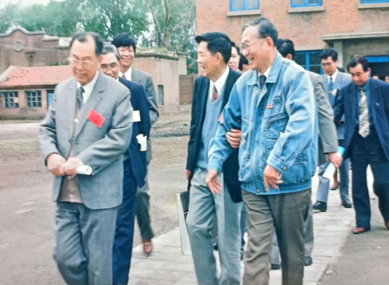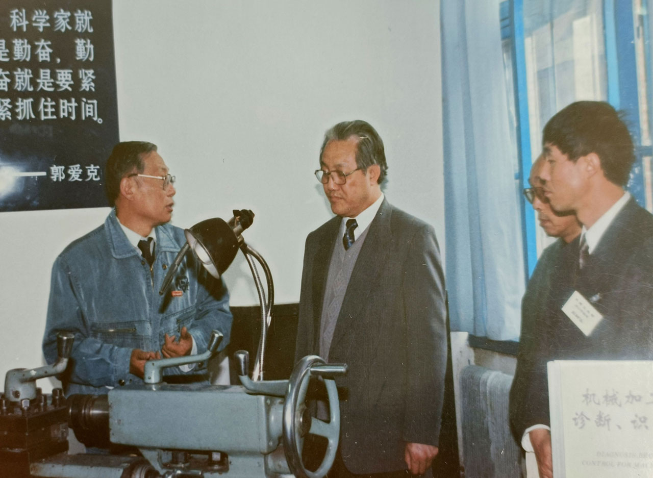1997年5月20-21日,专家组对吉林工业大学“211工程”进行立项审核。图为于骏一与科研处处长邬惠东向到切削实验室考察的西安交通大学董事长史维祥教授汇报科研工作。