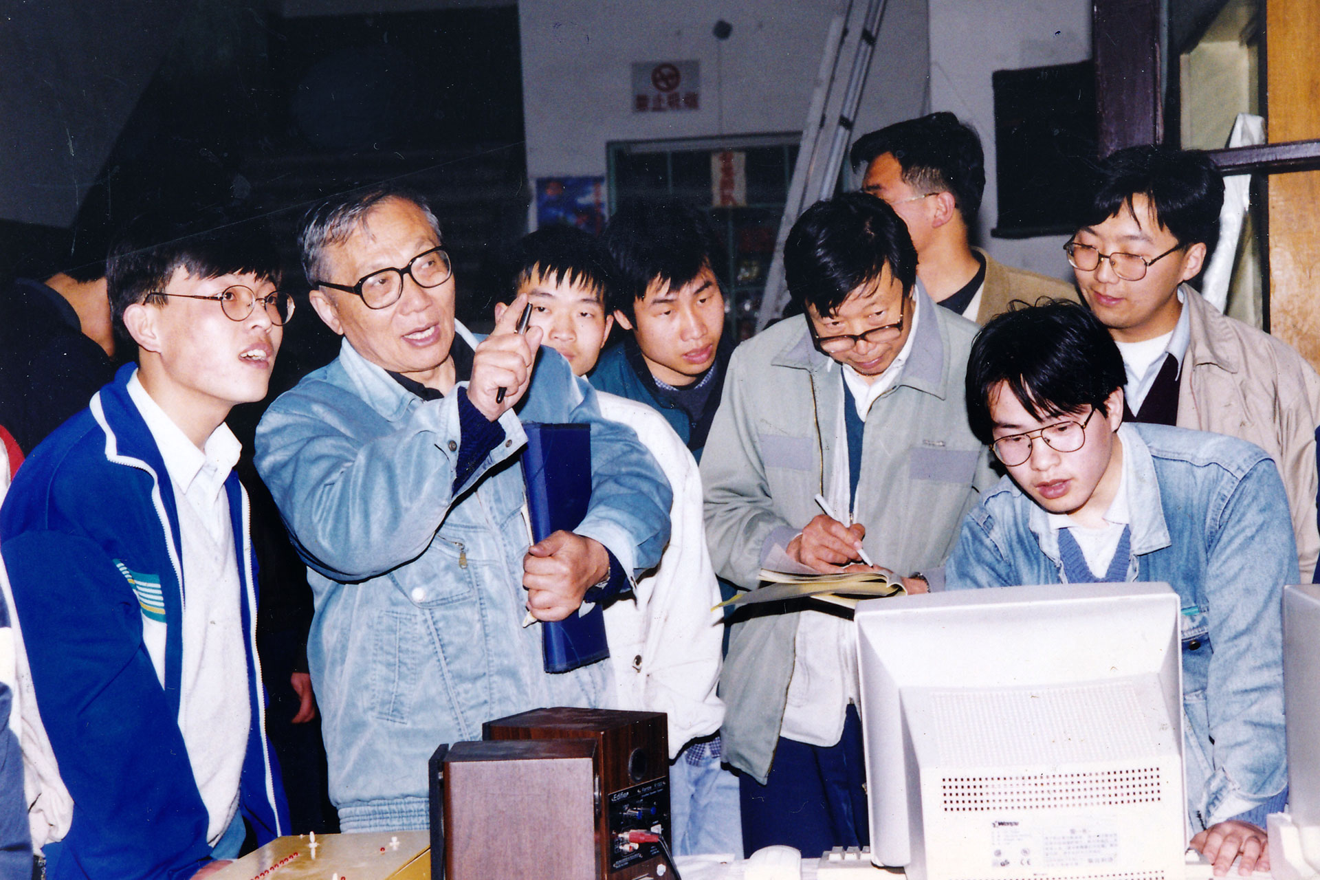 90年代初,于骏一在切削实验室正在给一组做实验的本科生分析实验数据处理结果