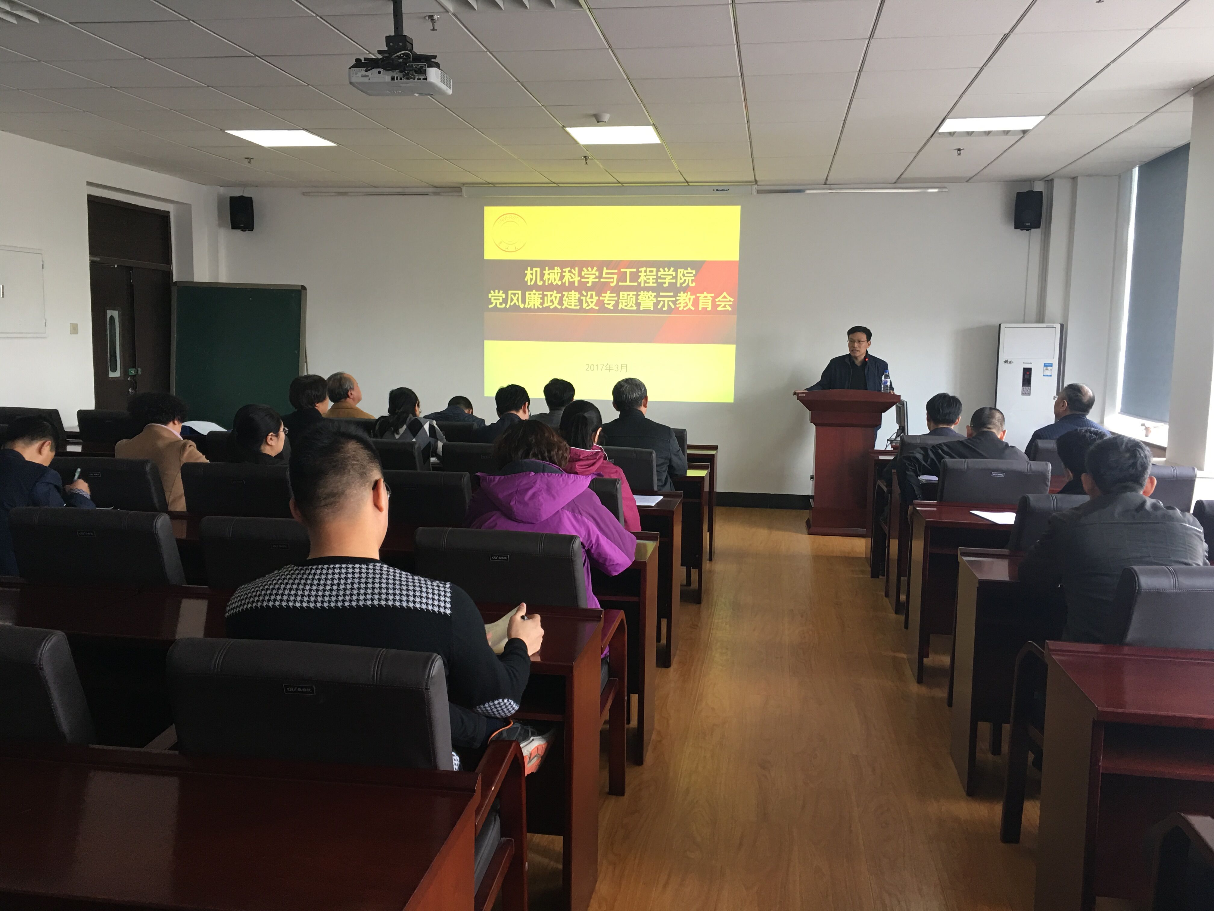 3月22日,机械科学与工程公司在机械馆召开党风廉政建设专题警示教育会。公司领导班子全体成员,党委委员、纪委委员、学术委员会主任委员、学位评定委员会主席、教学委员会主任委员、各系、室、中心主任、党支部书记、副书记,机关各科室主要负责人参加了会议。会议由公司党委书记程钺主持。