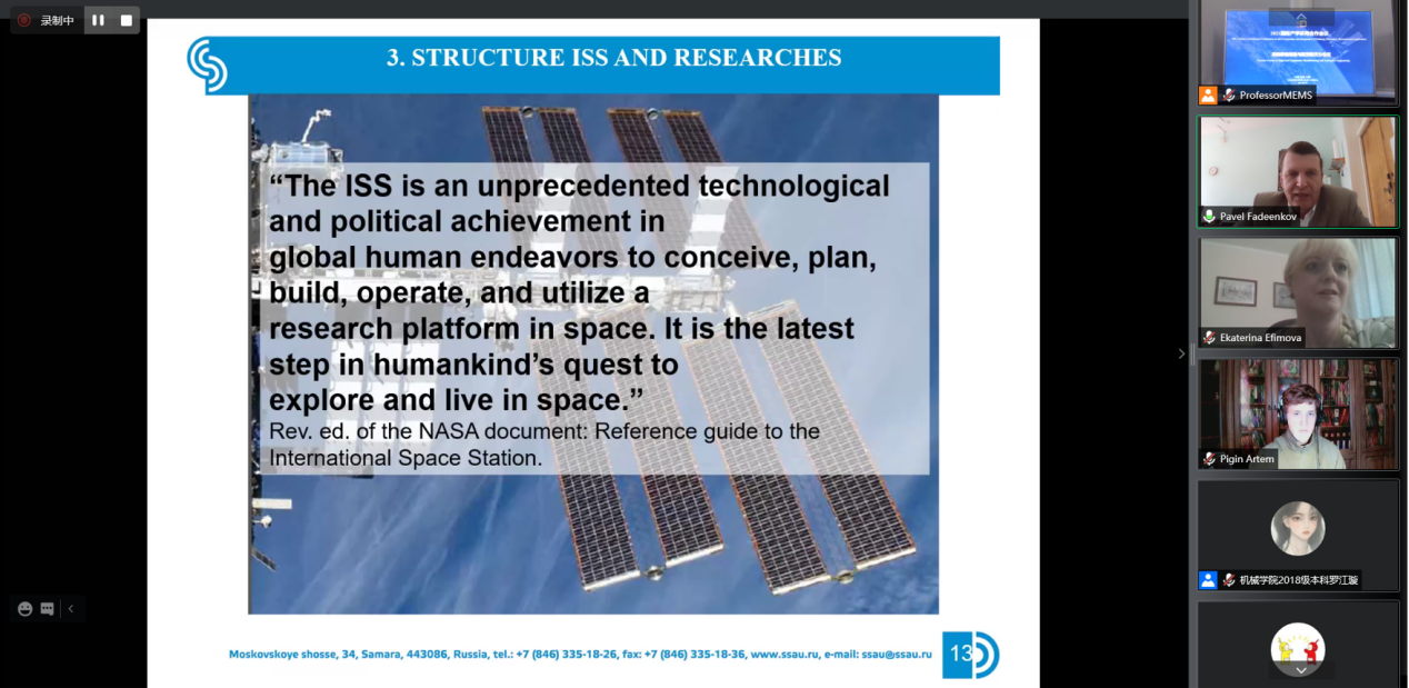 分论坛邀请了来自俄罗斯莫斯科物理技术公司、俄罗斯萨马拉国立航空航天大学、乌兹别克斯坦塔什干国立技术大学、上海大学和古天乐代言太阳集团的专家作会议报告。报告围绕高端装备制造,涵盖飞机发动机制造技术、飞行器结构设计、国际空间站技术、宇航员人因工程、无人机制造等内容。专家们分享了最新研究成果,就所在领域的发展方向、核心技术研发以及工艺实现等方面进行了深入交流探讨,并与与会师生进行了线上互动。