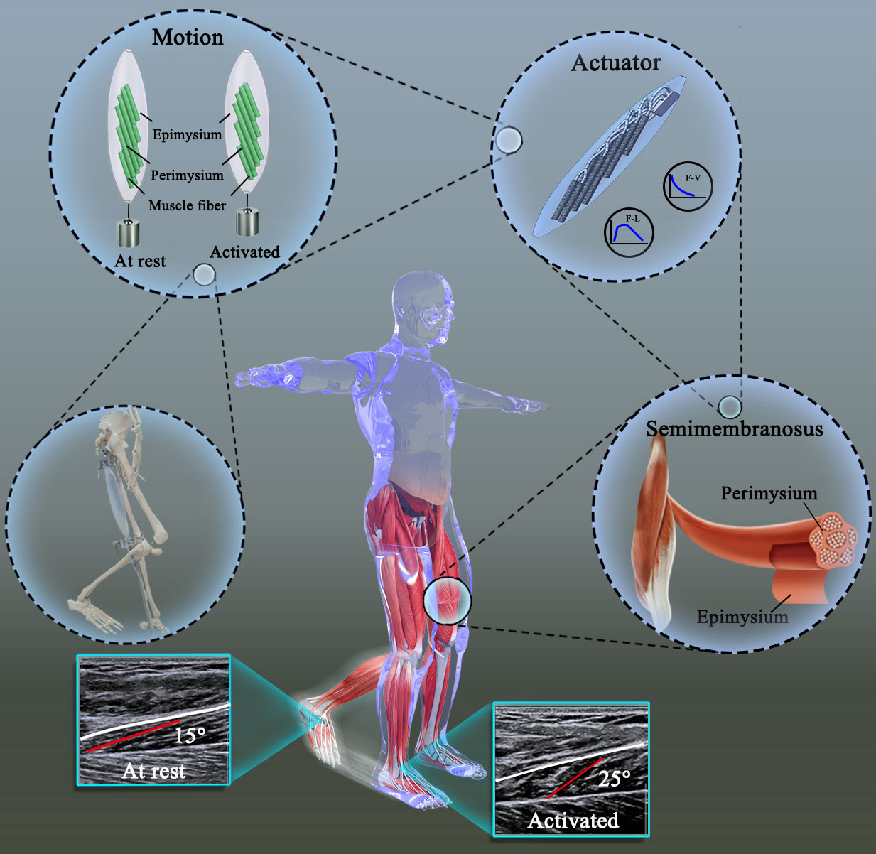 仿骨骼肌柔性驱动器以骨骼肌的结构组成、肌纤维构型及其运动机理为灵感,利用柔性材料的自适应变形提供可变传动机制,自动根据外部负荷条件调节速度输出,而不需要传感和控制。团队开发的仿肌肉-肌腱系统柔性驱动器,该驱动器具备力-速度特性,应力可达0.32MPa,提升自身220倍重物,应变可达11.6%,实现了仿骨骼肌驱动器高应力应变和高功率密度的收缩特性和力学特性的集成。在仿生机器人、主动假肢和外骨骼或康复机器人等领域具有广泛的应用前景。