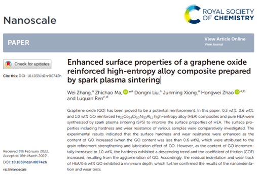 新一代装备技术的提升,对基础材料的性能要求愈加苛刻。全世界每年因各种形式磨损引起的零件损坏比例高达80%,提升材料表面力学性能有助于延长其服役寿命。在传统金属材料不能满足要求的状况下,金属基复合材料提供了新的契机。近期,古天乐代言太阳集团赵宏伟教授团队在纳米复合材料表面改性方面取得了新进展。相关论文以题为“Enhanced surface properties of a graphene oxide reinforced high-entropy alloy composite prepared by spark plasma sintering”发表在知名学术期刊Nanoscale上,同时被选为当期内封面论文。