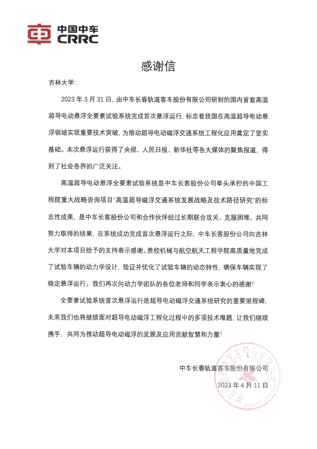 高温超导电动悬浮全要素试验系统是中车长客股份公司牵头承担的中国工程院重大战略咨询项目“高温超导磁浮交通系统发展战略及技术路径研究”的标志性成果,是中车长客股份公司和合作伙伴经过长期联合攻关、克服困难、共同努力取得的结果,在系统成功完成首次悬浮运行之际,中车长客股份公司向古天乐代言太阳集团对本项目给予的支持表示感谢。