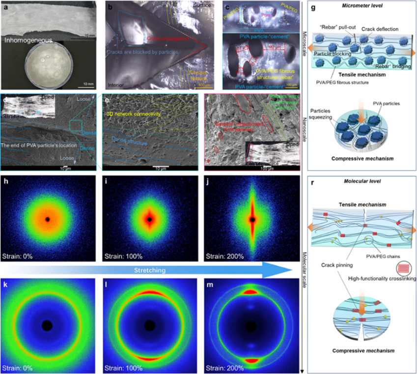 通过深入研究自然关节软骨的独特结构,研究团队开发出了一种仿生的“混凝土状”结构PVA/PEG水凝胶,即BPP水凝胶(图1)。该设计灵感来源于软骨中由胶原纤维和蛋白多糖组成的复合结构,其中胶原纤维类似于混凝土中的钢筋,而蛋白多糖则类似水泥基体。在BPP水凝胶的设计中,基于霍夫梅斯特效应和机械训练的PVA/PEG纤维网络充当了“钢筋”的角色,提供了必要的拉伸强度和弹性;而部分未完全溶解的PVA颗粒作为“水泥”,增强了材料的整体硬度和承载能力。通过原位拉伸过程中的SAXS/WAXS测试观察到,在拉伸过程中,层状晶体信号逐渐消失,取而代之的是更为明显的纤维晶体信号,这表明拉伸过程促进了分子链的定向排列和结晶度的提高(图2)。原位测试证明了这种独特的仿生结构,其不仅使得BPP水凝胶能够在拉伸时形成高度紧凑的PVA/PEG纤维网络,还在压缩时通过刚性PVA颗粒间的相互挤压分散应力,从而显著提升了材料的机械性能。
