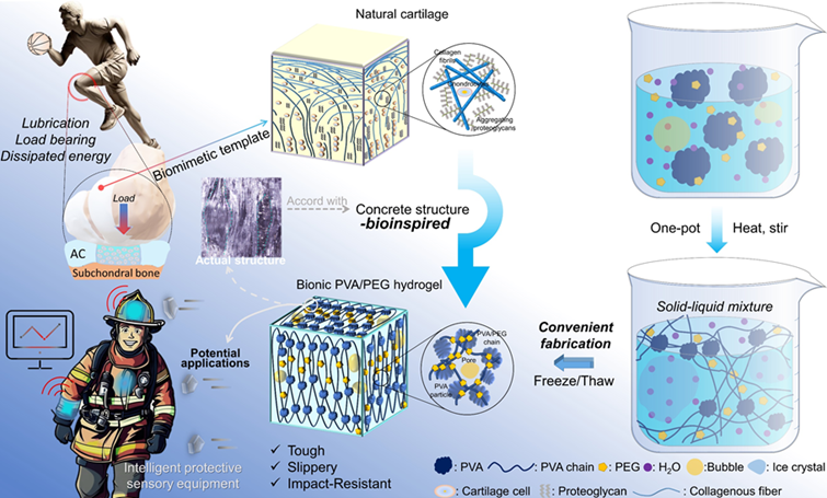 随着对具有优异机械性能的合成水凝胶需求的增长,研究人员不断寻求通过生物启发的设计来提升这些材料的强度、模量、韧性、耐磨性及抗冲击性能。受关节软骨启发,研究团队探索了如何通过模仿自然软骨的结构特性来开发一种新型的PVA/PEG水凝胶。这种材料不仅需要具备足够的机械强度以应对冲击载荷和循环摩擦条件,还需要拥有良好的生物相容性和简易的制备工艺,可以应用于防护感知装备等传感设备中。通过原位SAXS/WAXS测试和高速冲击原位测试,验证了水凝胶的优异机械性能。