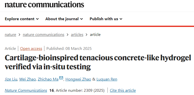 这项工作为开发低成本、高性能和生物相容性的水凝胶材料提供了新的思路,并且拓宽了其在实际应用中的前景,特别是在智能防护感知装备领域展现出广泛的应用潜力。论文得到国家重点研发计划项目、国家自然科学基金重大研究计划重点项目和国家重大科研仪器研制项目的资助,以“Cartilage-Bioinspired Tenacious Concrete-like Hydrogel Verified via In-situ Testing”为题在线发表于国际期刊Nature Communications上。公司直博生刘继泽为论文的第一作者,马志超教授为论文的通讯作者,任露泉院士和赵宏伟教授给予了理论指导和技术支持。