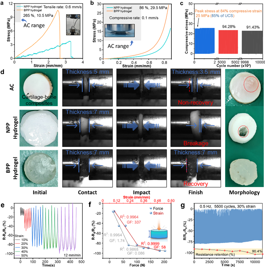 图3. BPP水凝胶的力学性能、抗冲击性能与传感性能