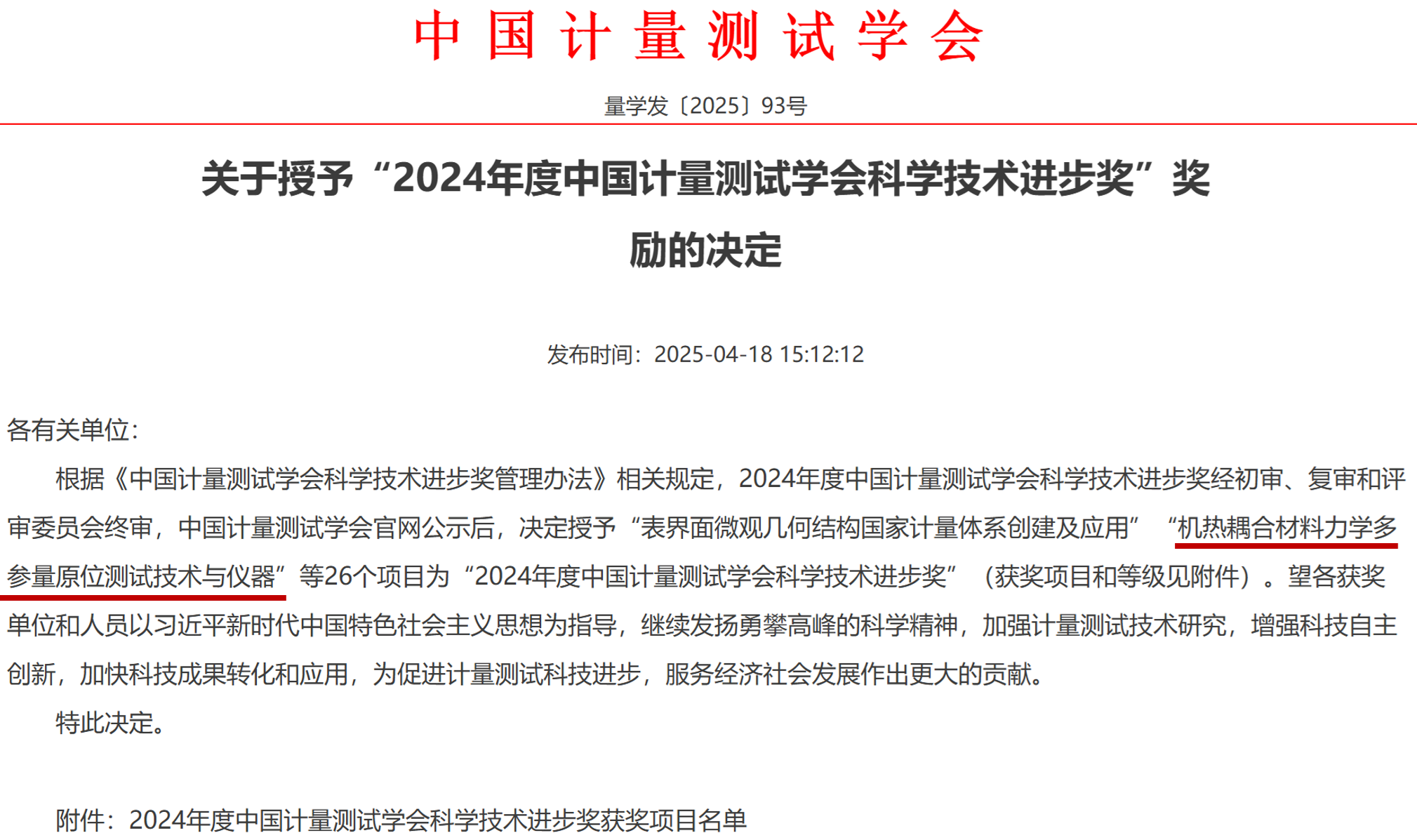 近日,中国计量测试学会公布2024年度中国计量测试学会科学技术进步奖授奖名单,公司马志超教授牵头完成的“机热耦合材料力学多参量原位测试技术与仪器”项目获一等奖。