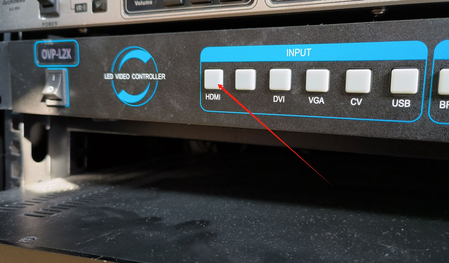 二、打开视频控制器开关(讲桌旁边机柜内,已经连接好无线投屏接收器)并设置为第1项“HDMI”。HDMI键亮绿色灯即为切换成功。