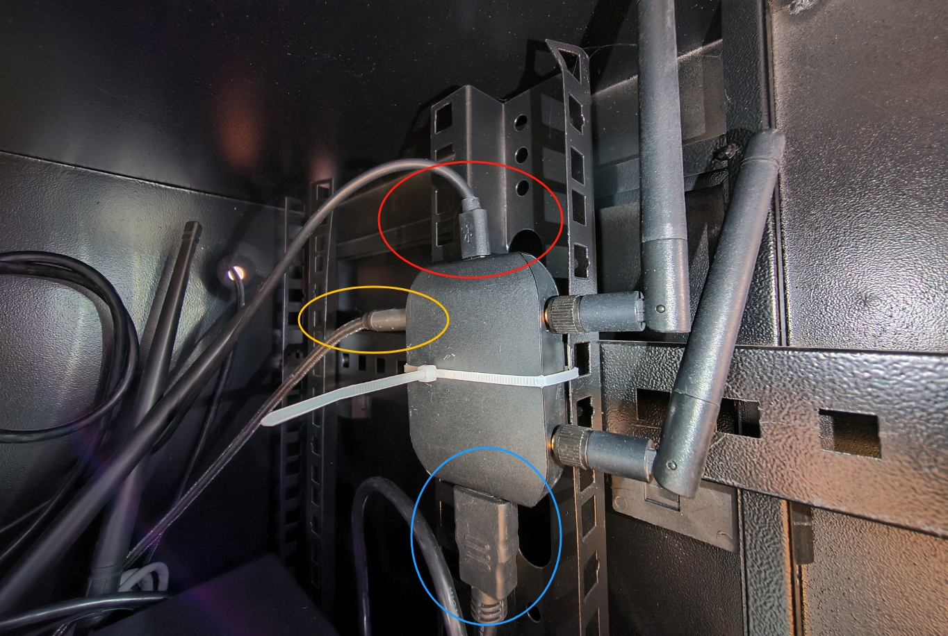 四、如果设置为“HDMI”后黑屏,请检查机柜内投屏接收器连接是否正常。如下图(红色为USB供电,黄色为音频,蓝色为视频):