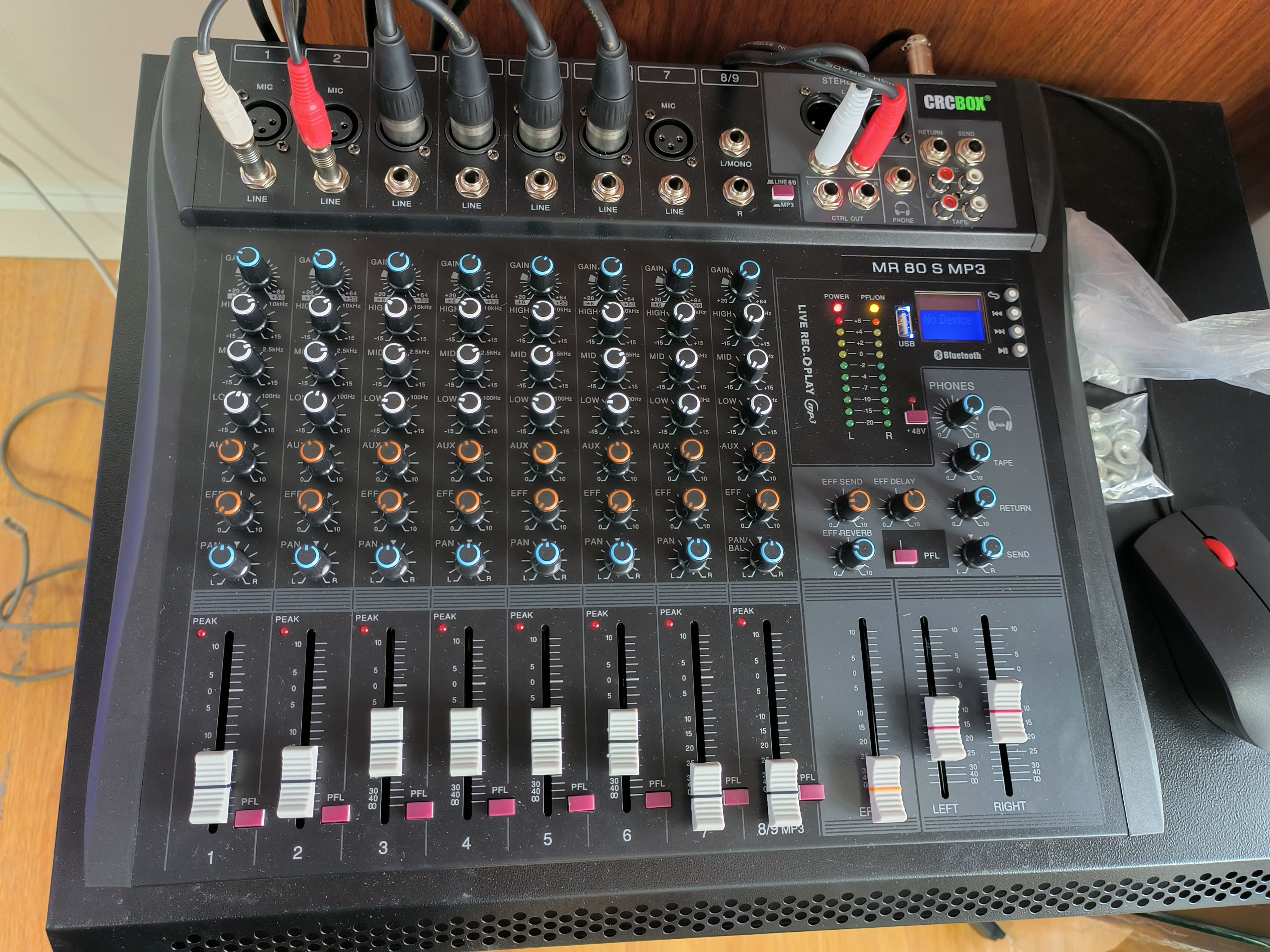 左起1、2号推子为电脑音频,3-6号推子为无线麦克风。推子推至1/3为宜,最大不超过2/3。