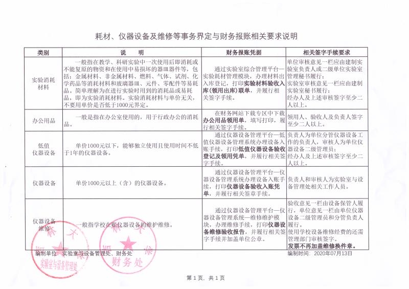 耗材、仪器设备及维修等事务界定与财务报账相关要求说明