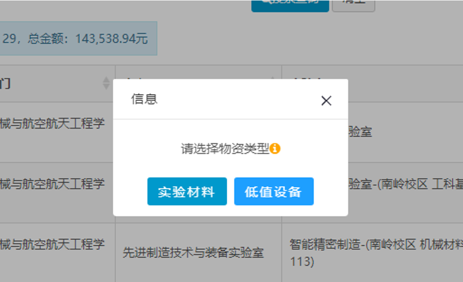 说明:实验耗材类请选择实验材料,部分耐用低值设备(1000元以下)请选择低值设备。例如1000元以下的打印机财务处要求选择低值设备。但一般刀具、电机、芯片、电钻工具等选择实验材料。