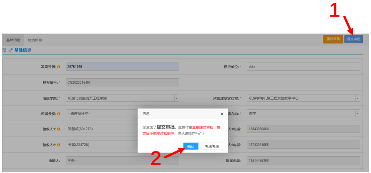 检查无误后,如下图依次点击,提交审批并确认:(1)提交审批 (2)确认。